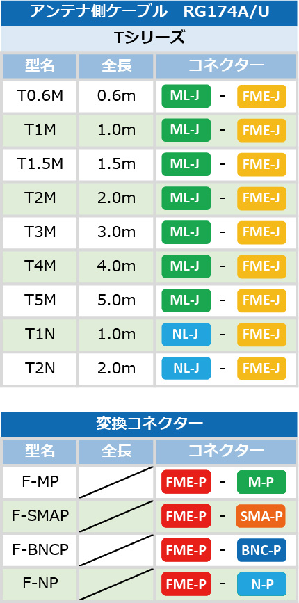 コネクタ種類・長さなどは下記の表をご覧ください。